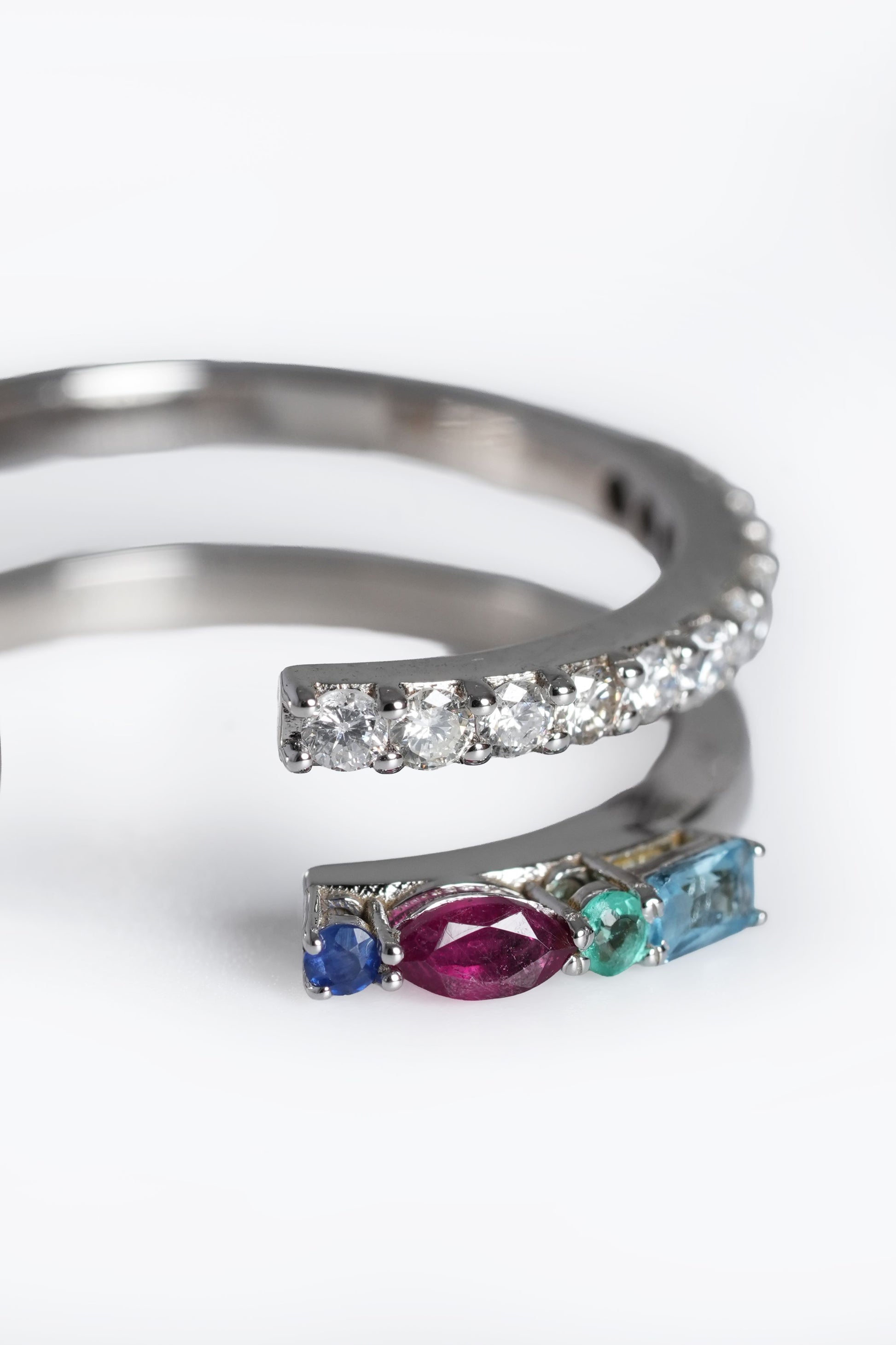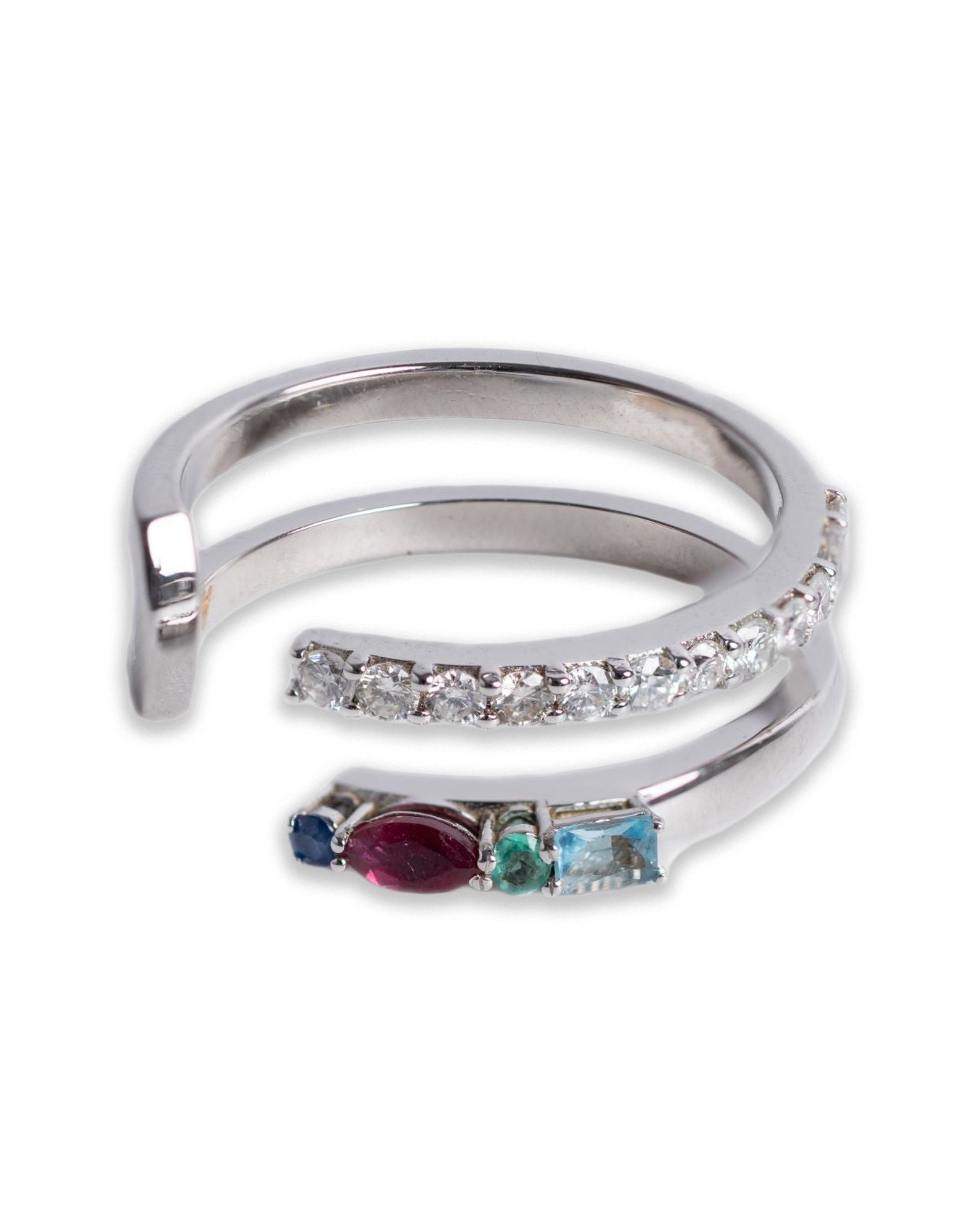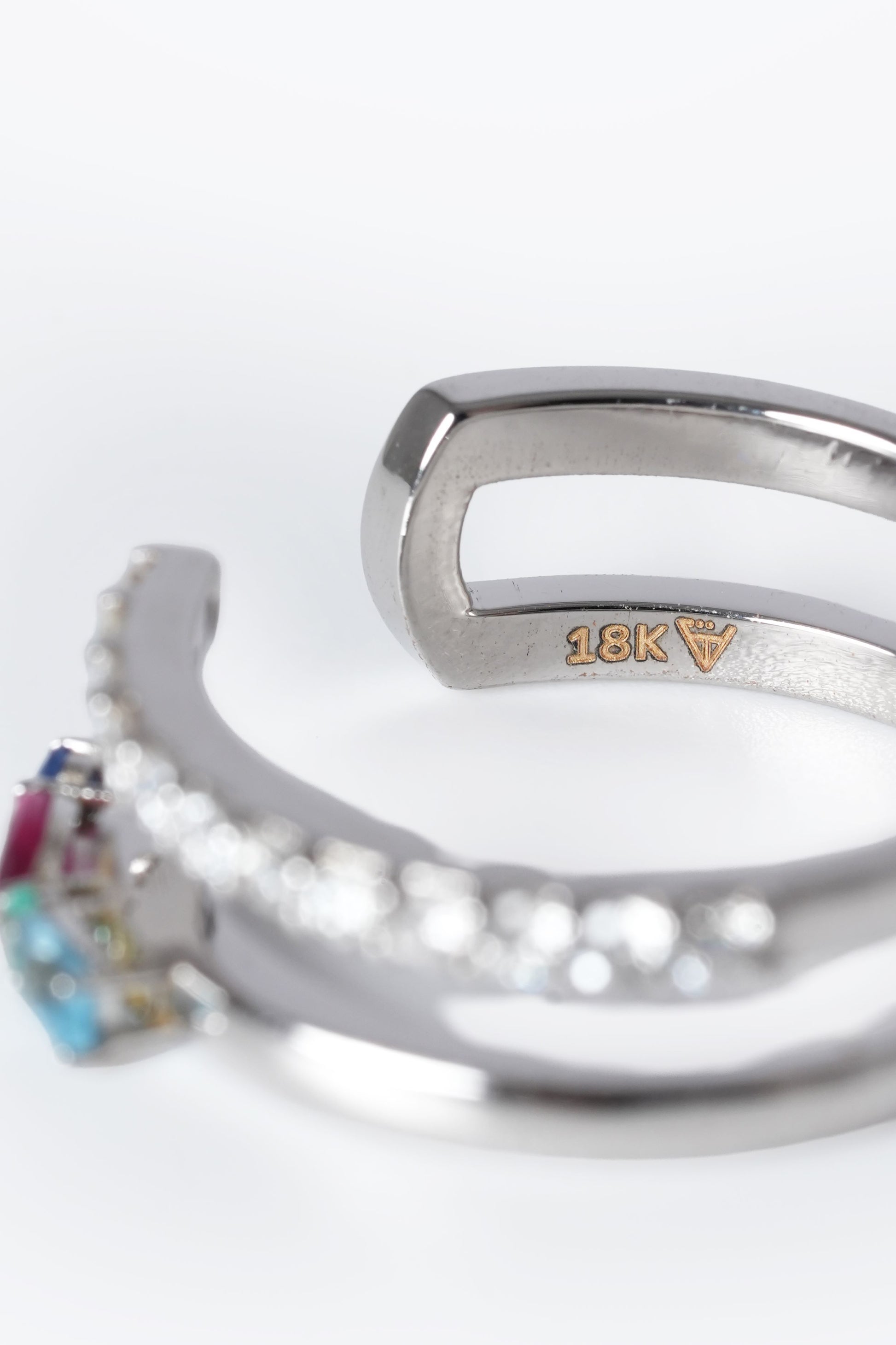 Crafted in 18K White Gold, this refined open ring features a vibrant mix of gemstones, complemented by a row of natural diamonds set below for added brilliance and elegance.