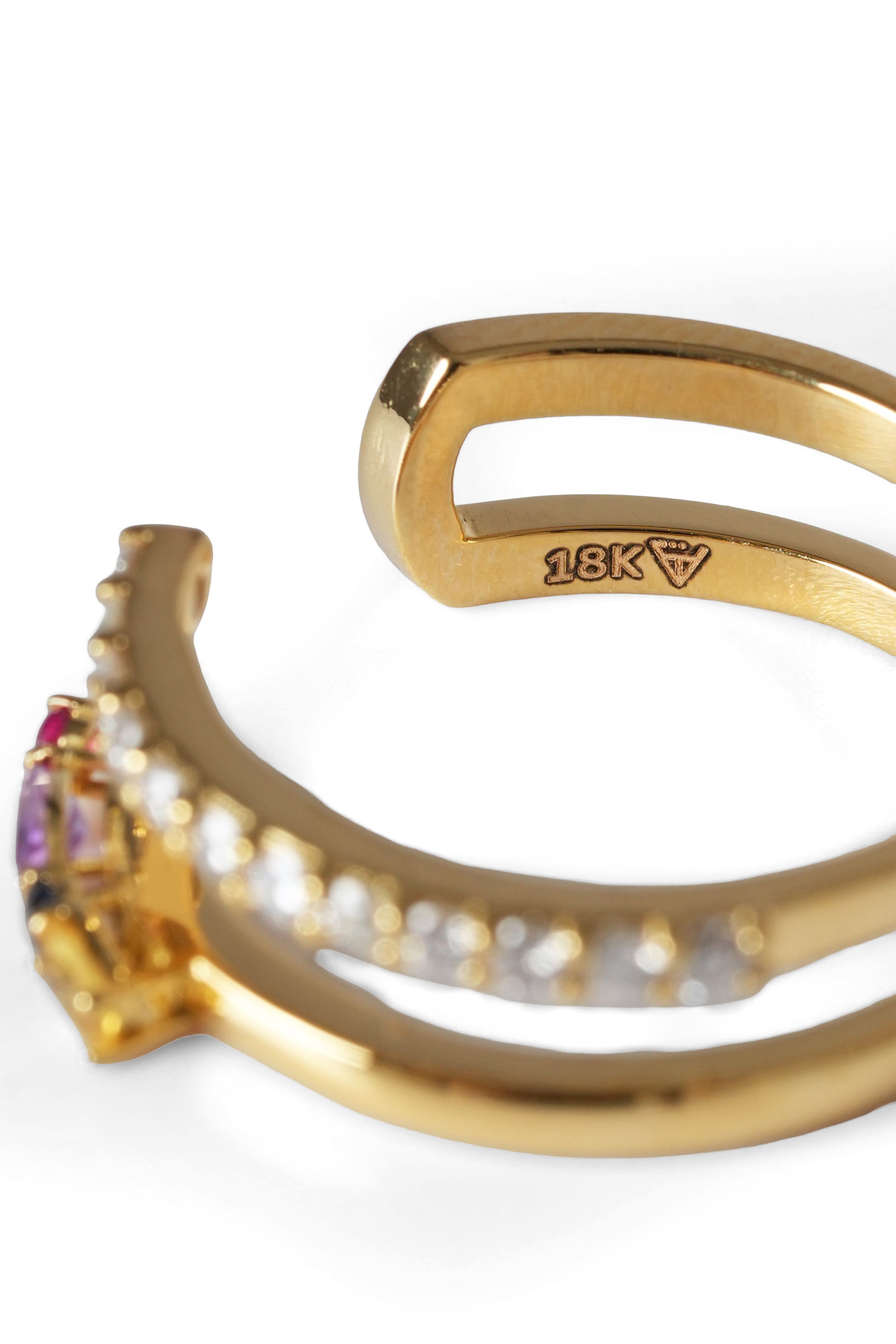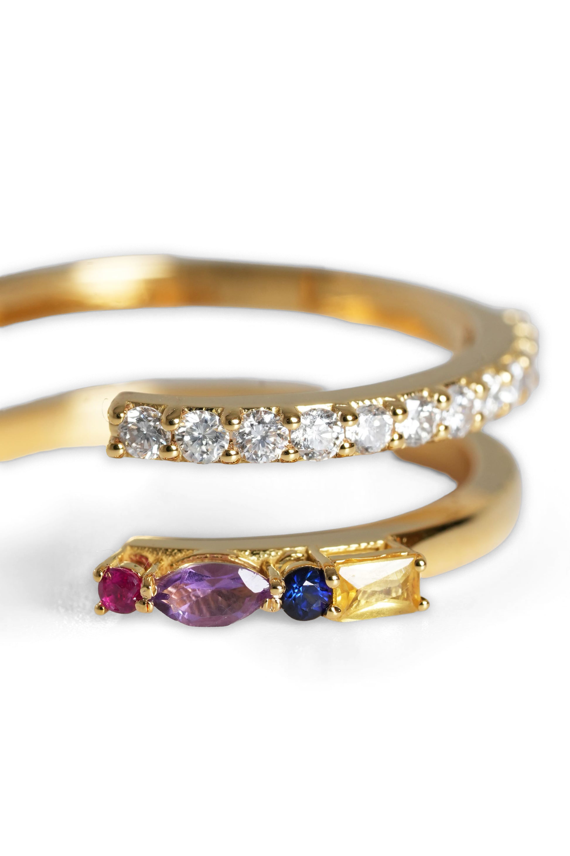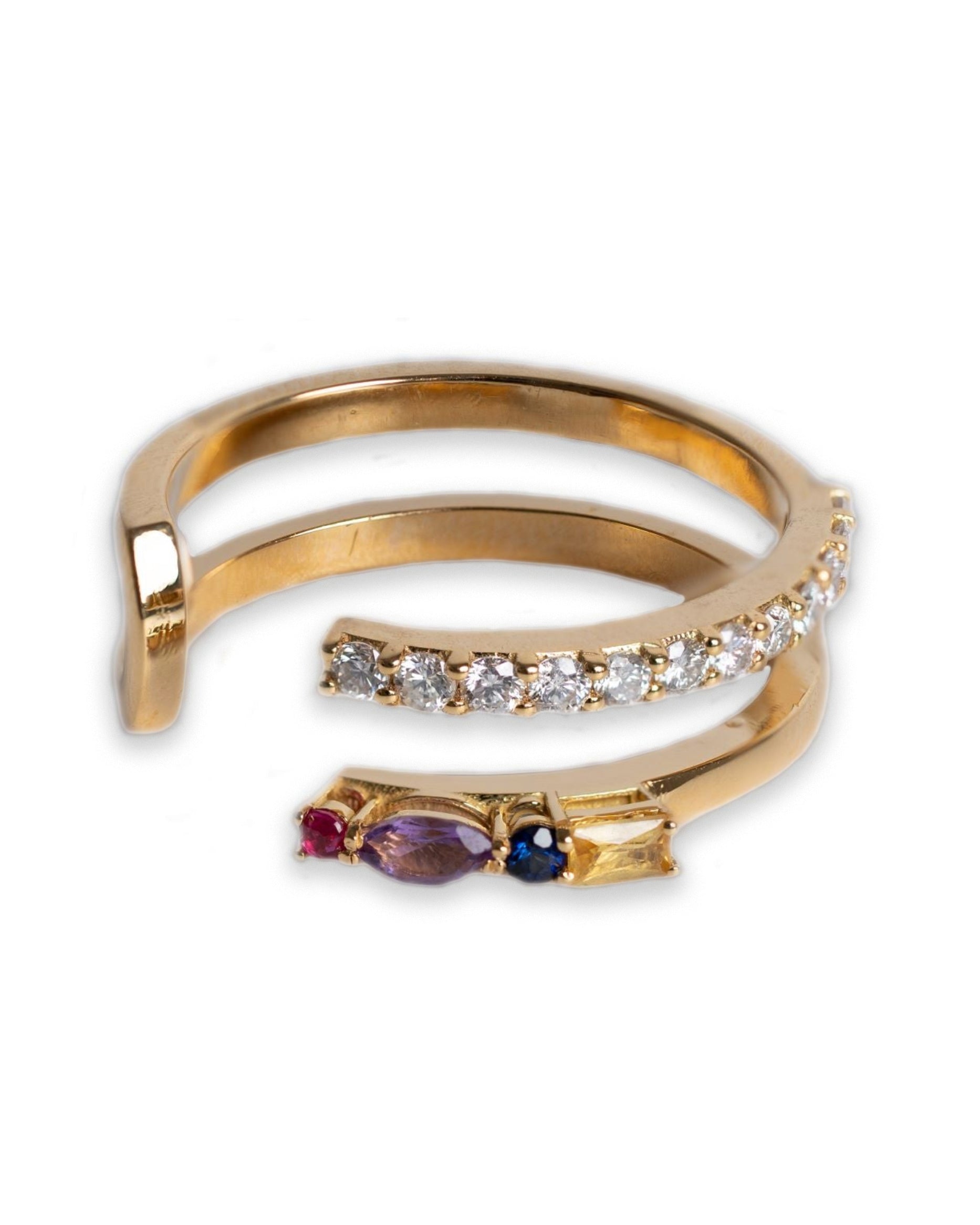 Crafted in 18K Yellow Gold, this refined open ring features a vibrant mix of gemstones, complemented by a row of natural diamonds set below for added brilliance and elegance.