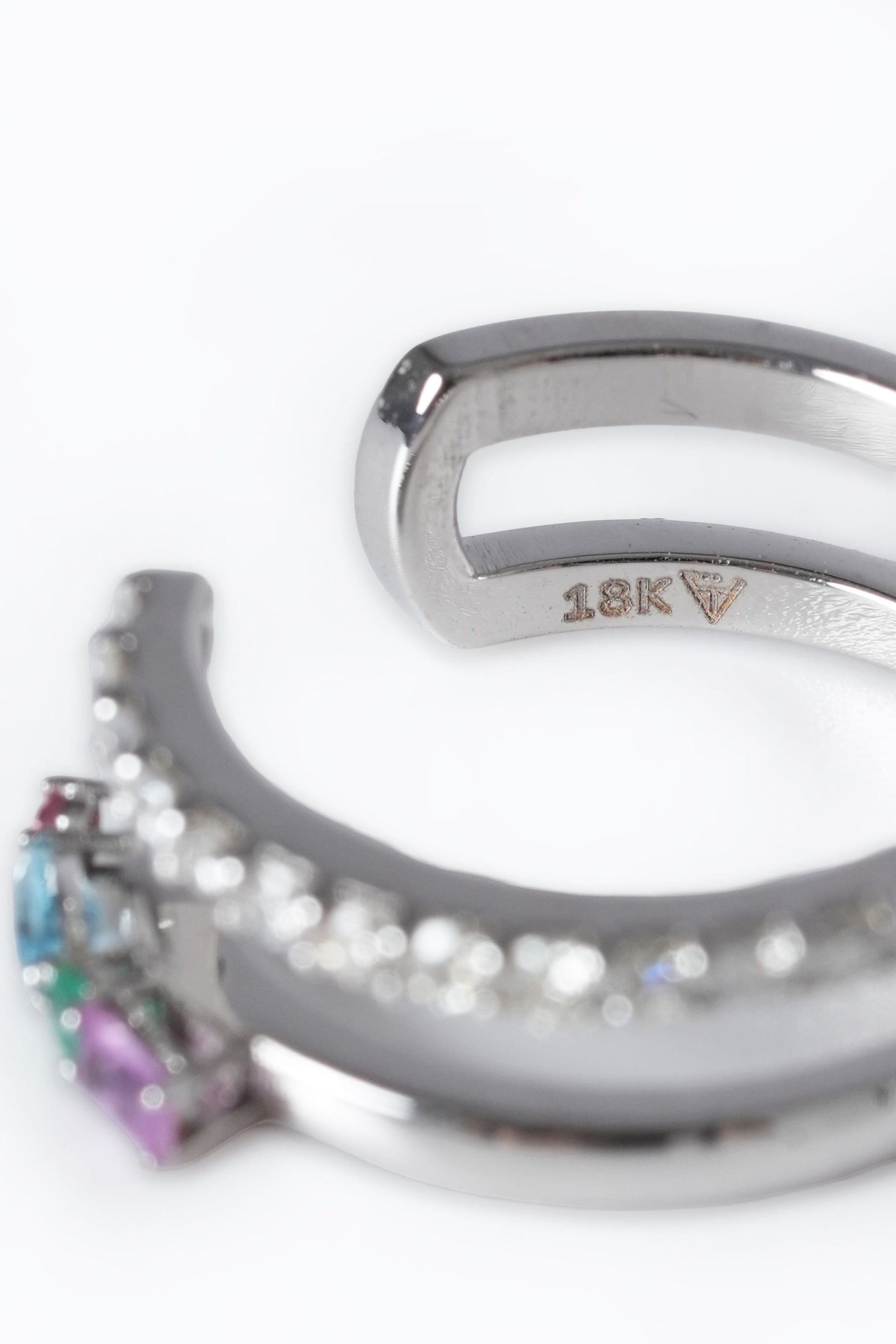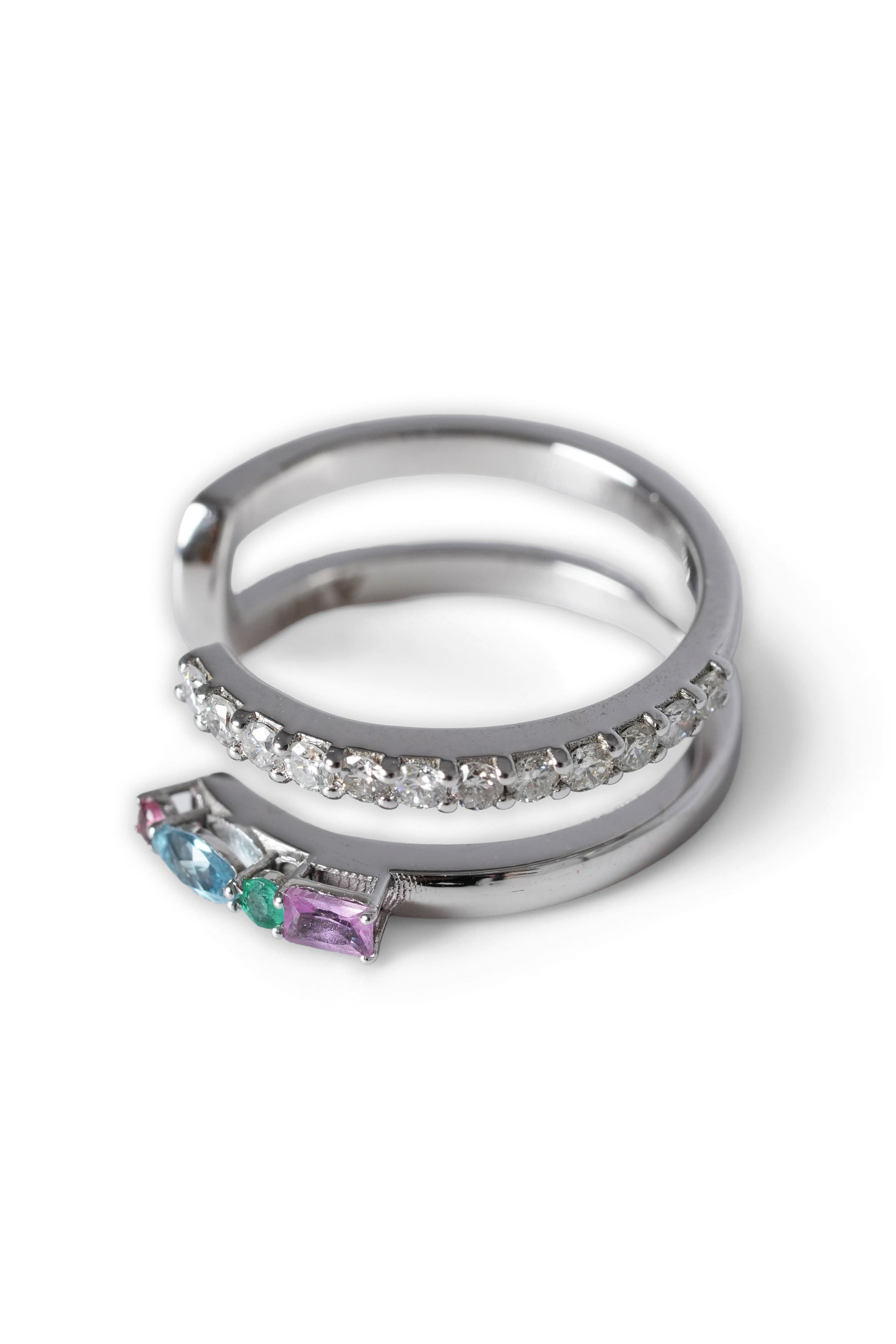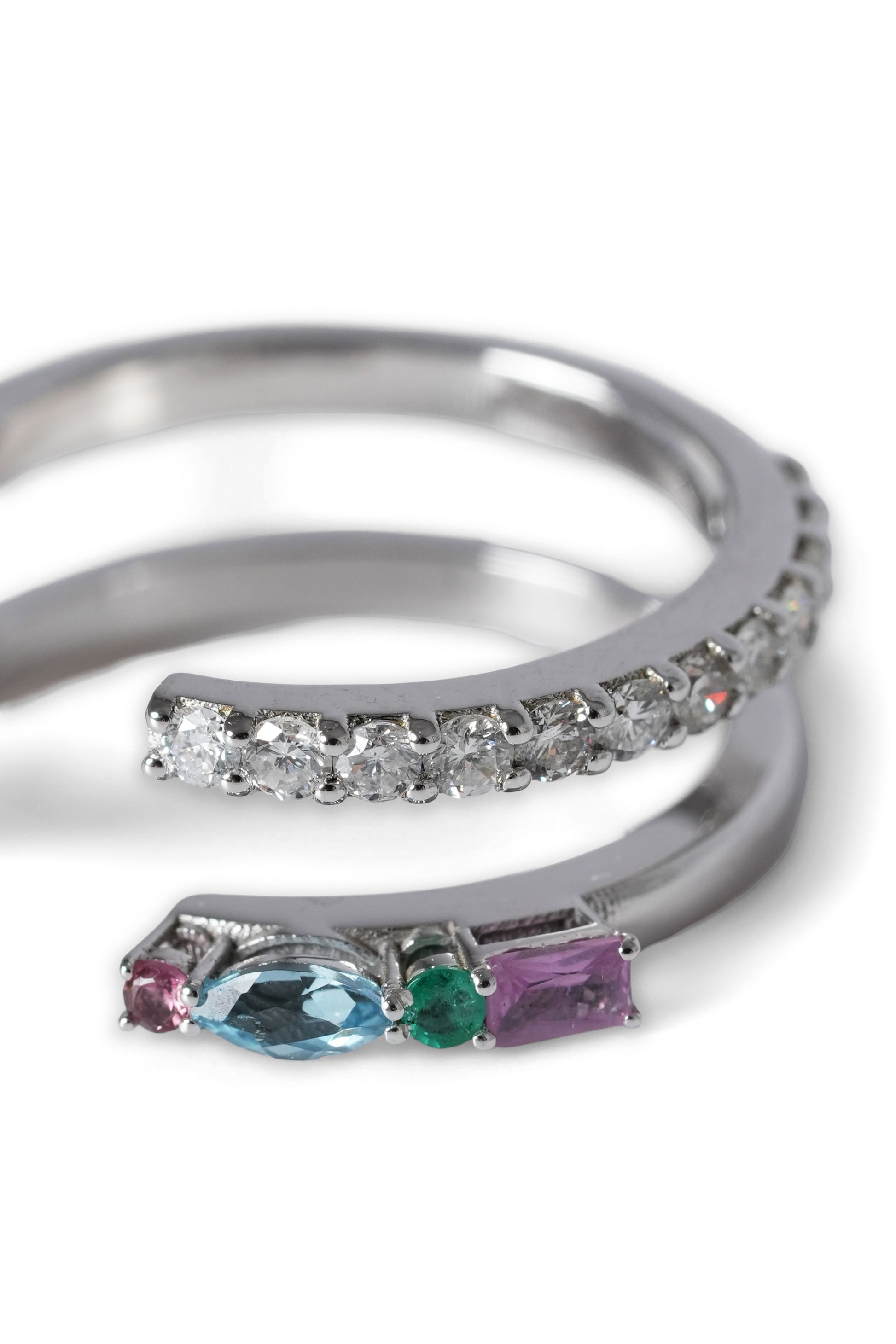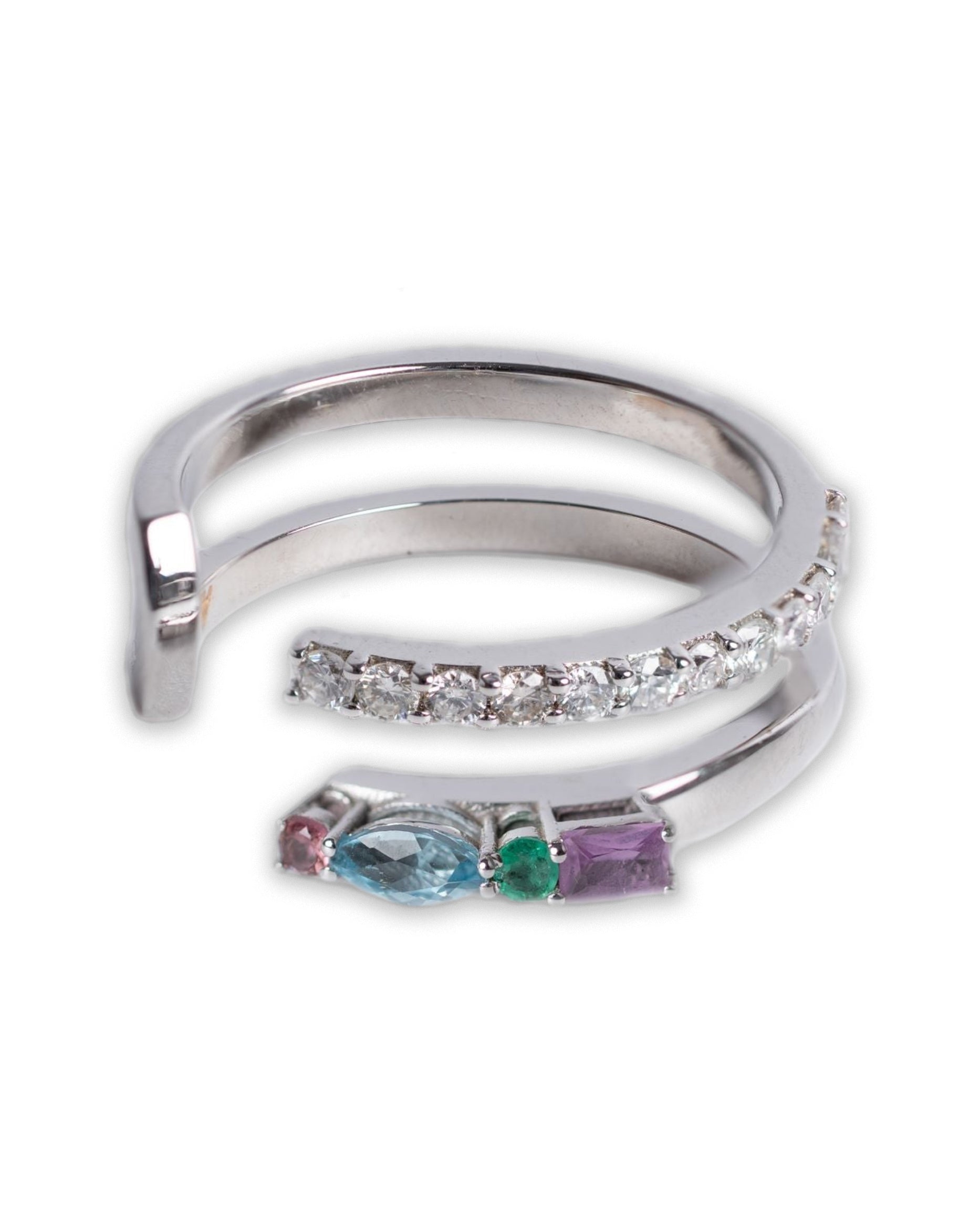 Crafted in 18K White Gold, this refined open ring features a vibrant mix of gemstones, complemented by a row of natural diamonds set below for added brilliance and elegance.