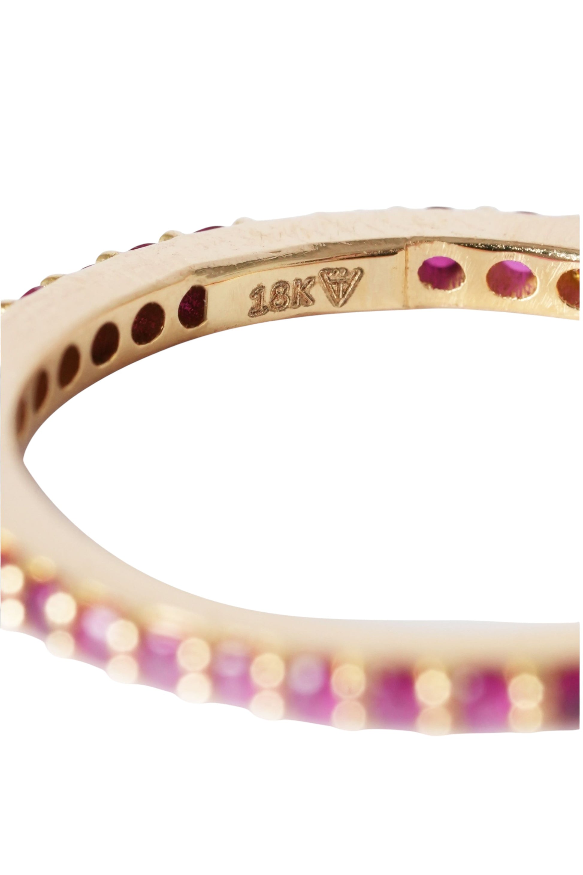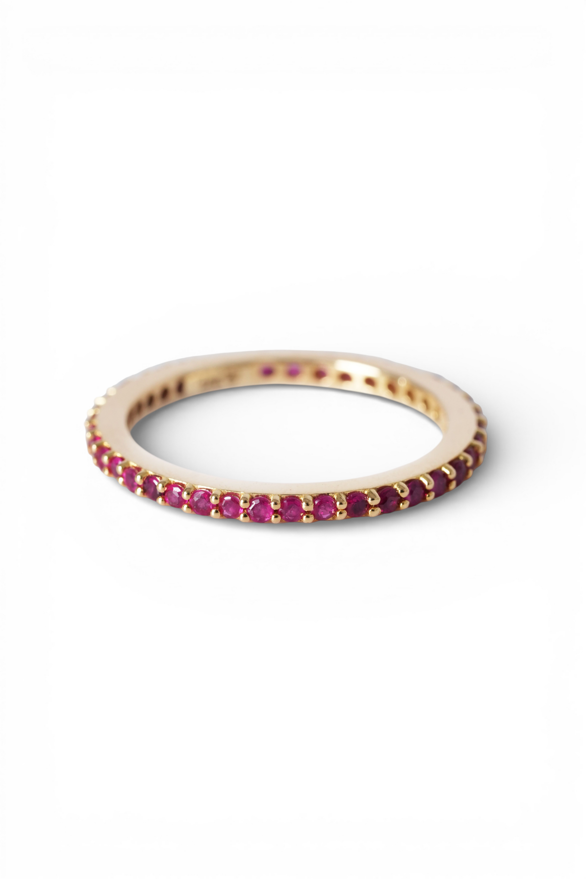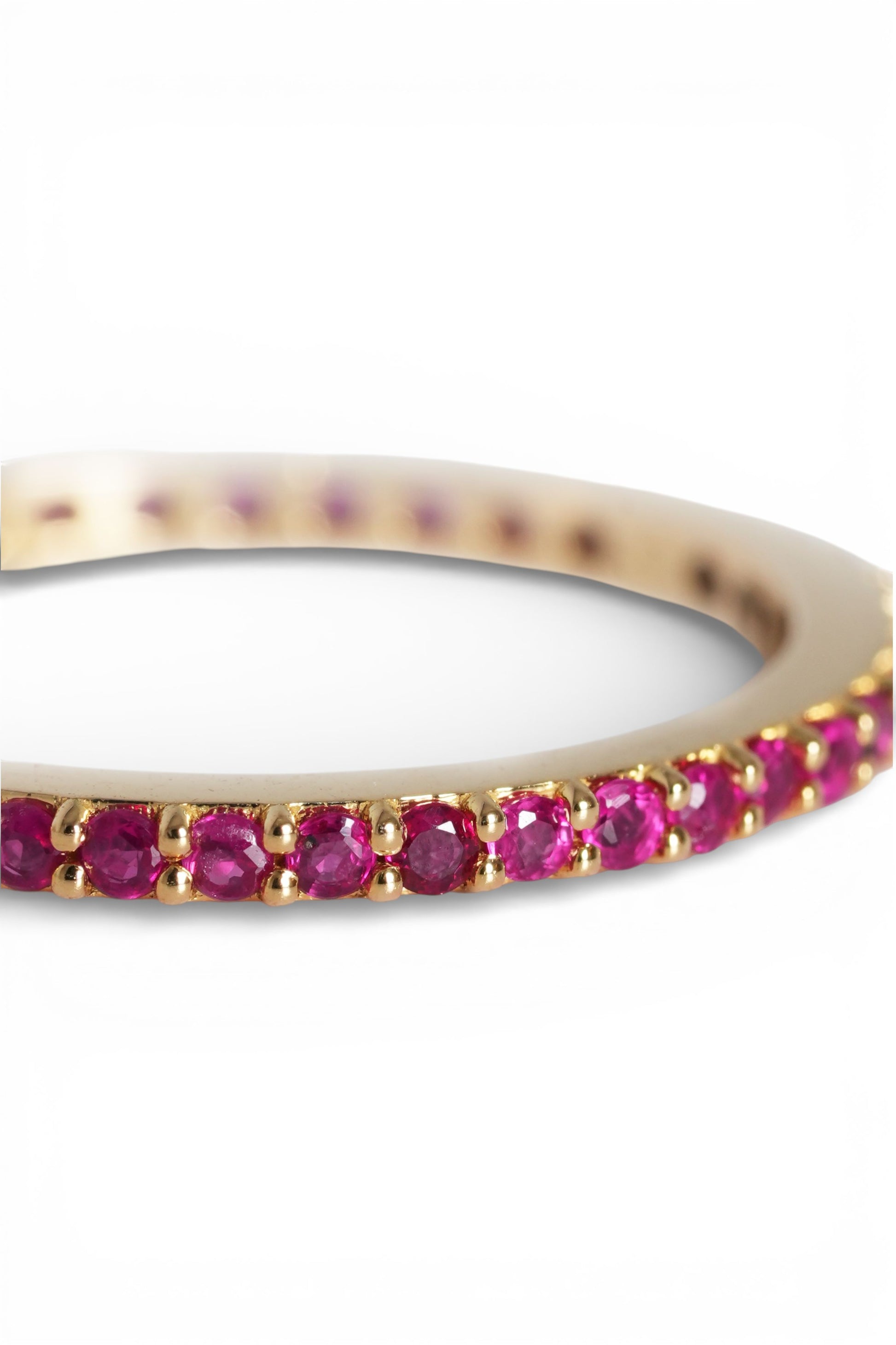 Our eternity band, crafted in 18K Yellow Gold, is set with Ruby encircling the band, symbolizing everlasting beauty and commitment.
